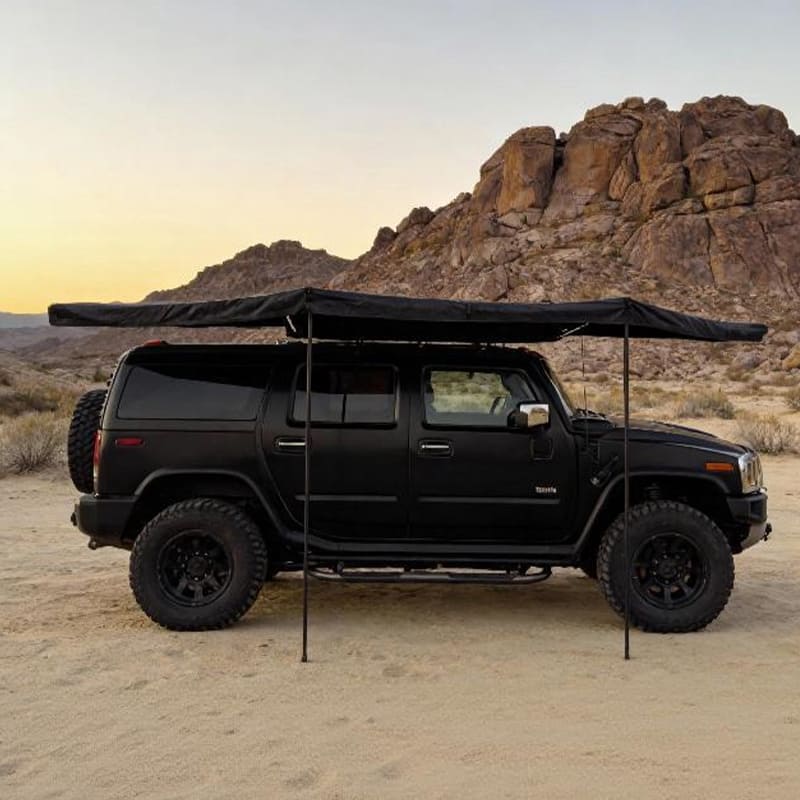 Our Freestanding Car Awning is designed for the solo traveler. Unlike traditional awnings that droop instantly, our reinforced aluminum truss system holds the fabric tension on its own during setup. While we include heavy-duty aluminum poles for anchoring in windy conditions, the freestanding structure makes the initial deployment effortless and fast.