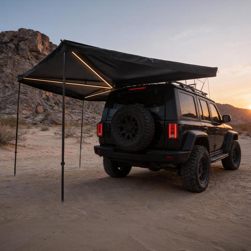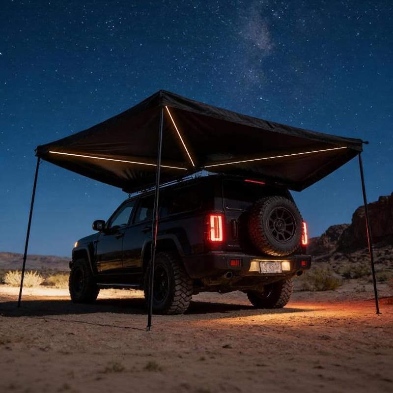 We have upgraded the classic Batwing Awning with a state-of-the-art lighting system. Every structural arm houses a Full-Length Integrated LED Strip. Whether your customers are cooking dinner or repairing gear, the bright, warm light covers the entire 10sqm+ sheltered area. The system is powered via a simple 12V connection, making it a true “plug-and-play” solution.